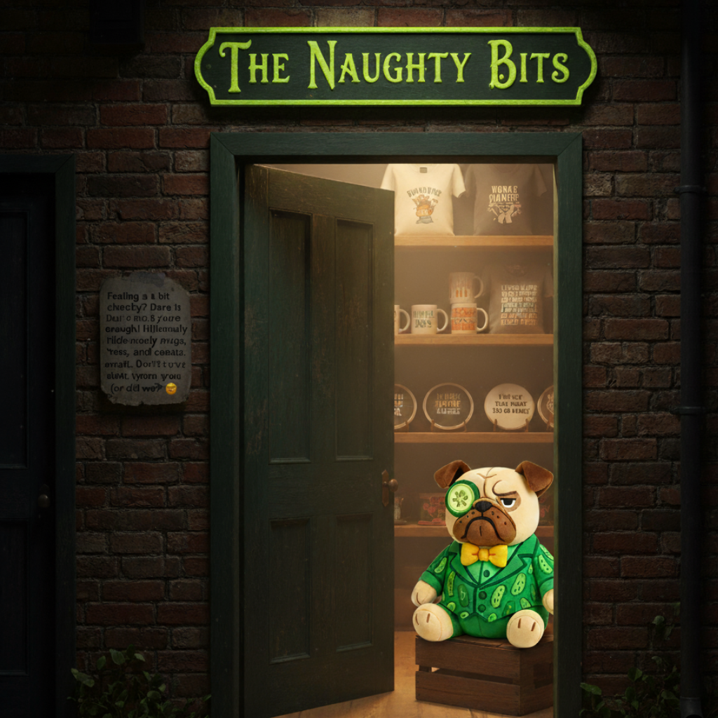 Hark! What's this? Tucked away in a dimly lit corner, beyond the reach of the easily offended, lies the secret entrance to 'The Naughty Bits'. The sole guardian of this hallowed hall of hilarious vulgarity is none other than Sir Cucumber Dog himself. Don't be fooled by the plush exterior and dapper yellow bow tie; his cucumber-monocled eye is a shrewd judge of character, silently asking, "Are you cheeky enough to enter?" He stands firm on his wooden crate, a fluffy bouncer at the threshold of profanity, ensuring only the worthy may lay their eyes upon the glorious trove of mugs, tees, and coasters that lie within—merchandise so wonderfully rude, it would make a docker blush.