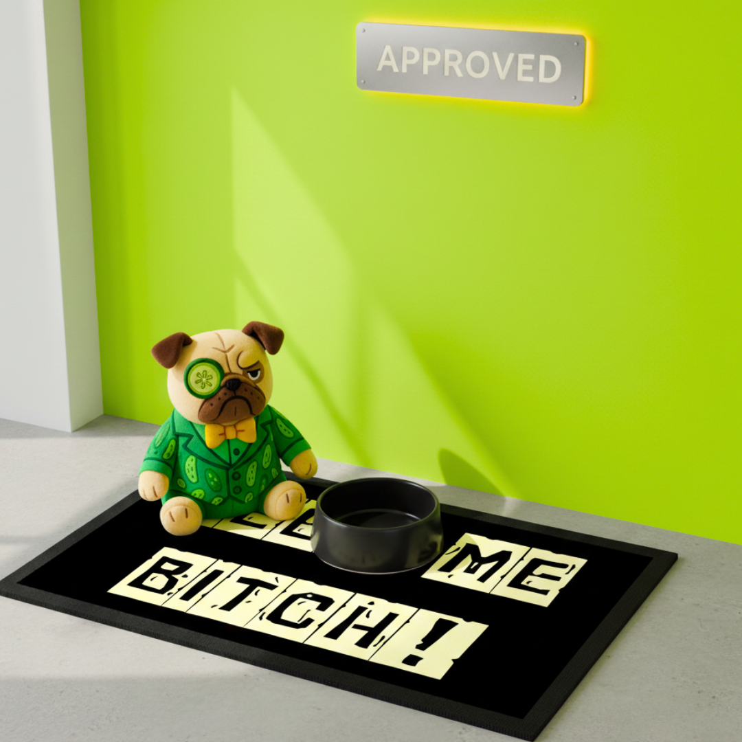 The boss has inspected the goods, and he's finally given his official stamp of approval. Introducing our brand-new collection of pet food mats, personally tested (and judged) by Sir Cucumber Dog himself! He's already making his demands known with our "Feed Me Bitch!" design, bringing our signature rude-and-funny style straight to your pet's dinner time. Stop letting your furry friend eat off a boring floor and give them (and your kitchen) the glow-up they deserve with a mat that's 100% boss-approved.