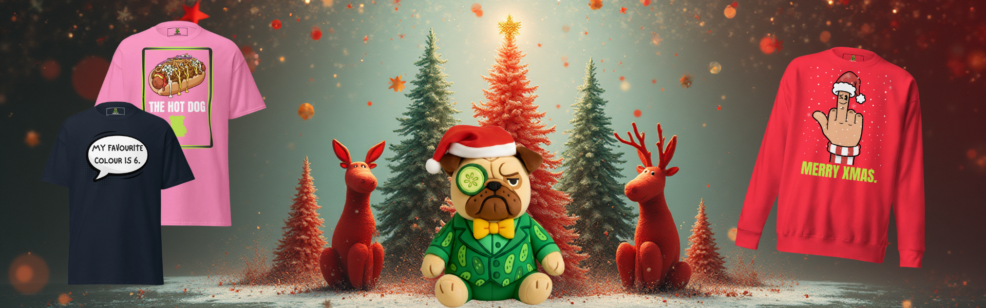 Alright, listen up you magnificent reprobates. Let me introduce you to the brains behind this whole ridiculous operation: Sir Cucumber Dog. He's the gaffer, the top dog, the pug in charge. Don't let the plush exterior and that snazzy cucumber-print suit fool you; from behind that cucumber monocle, he's judging your life choices and coming up with the next design that'll probably get you fired. He's the reason your nan will be questioning your sanity this Christmas. So, show some respect, buy a mug, and for goodness sake, don't stare directly at his bow tie – it's pure, concentrated genius.